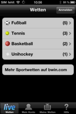 Die iPhone-App bwin live bietet Ihnen ein einzigartiges Wetterlebnis von der ersten Spielsekunde bis zum Schluss. Live-Wetten sind für die beliebtesten Sport-Events verfügbar – von Fußball über Tennis, Formel 1, American Football, Eishockey bis hin zu Ski-Rennen und vielem mehr. Platzieren Sie Ihre Wette blitzschnell mit nur 3 Klicks.