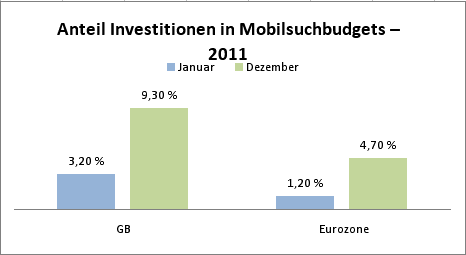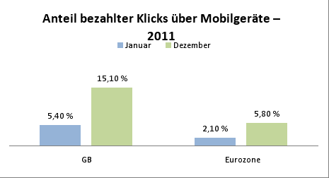 2011 war ein Wendepunkt: Gingen im Januar letzen Jahres in der Eurozone erst 2,1 Prozent der Klicks auf Google-Adwords auf das Konto mobiler Geräte wie Smartphones und Tablets, betrug der Anteil im Dezember bereits 5,8 Prozent, also fast dreimal so viel. Der „mobile“ Anteil in den SEA-Budgets wurde im gleichen Zeitraum sogar vervierfacht (von 1,2 auf 4,7 Prozent).